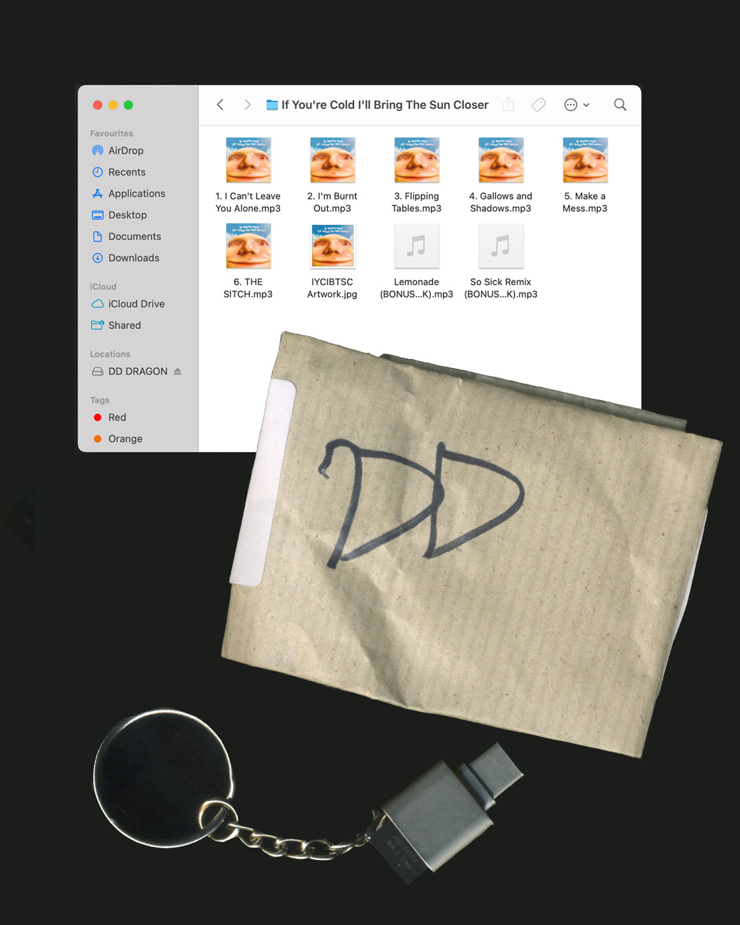 Volk Gallery is proud to present the work of DD Dragon. Each Volk artist is given a size limit and budget and left to their own devices. With this brief, Dragon has produced a previously unreleased EP that is “a bit too disturbed” for traditional streaming platforms. Songs are loaded onto mini SD cards (with an accompanying USB-C converter) so we can listen in our own chosen spaces. Tracks feature dark textures, gritty drums and fervent verses tossing and turning between becoming a devil and giving into lunacy. “I wrote it with the idea of if I let everything that stresses me out drive me mad, what would I become?”