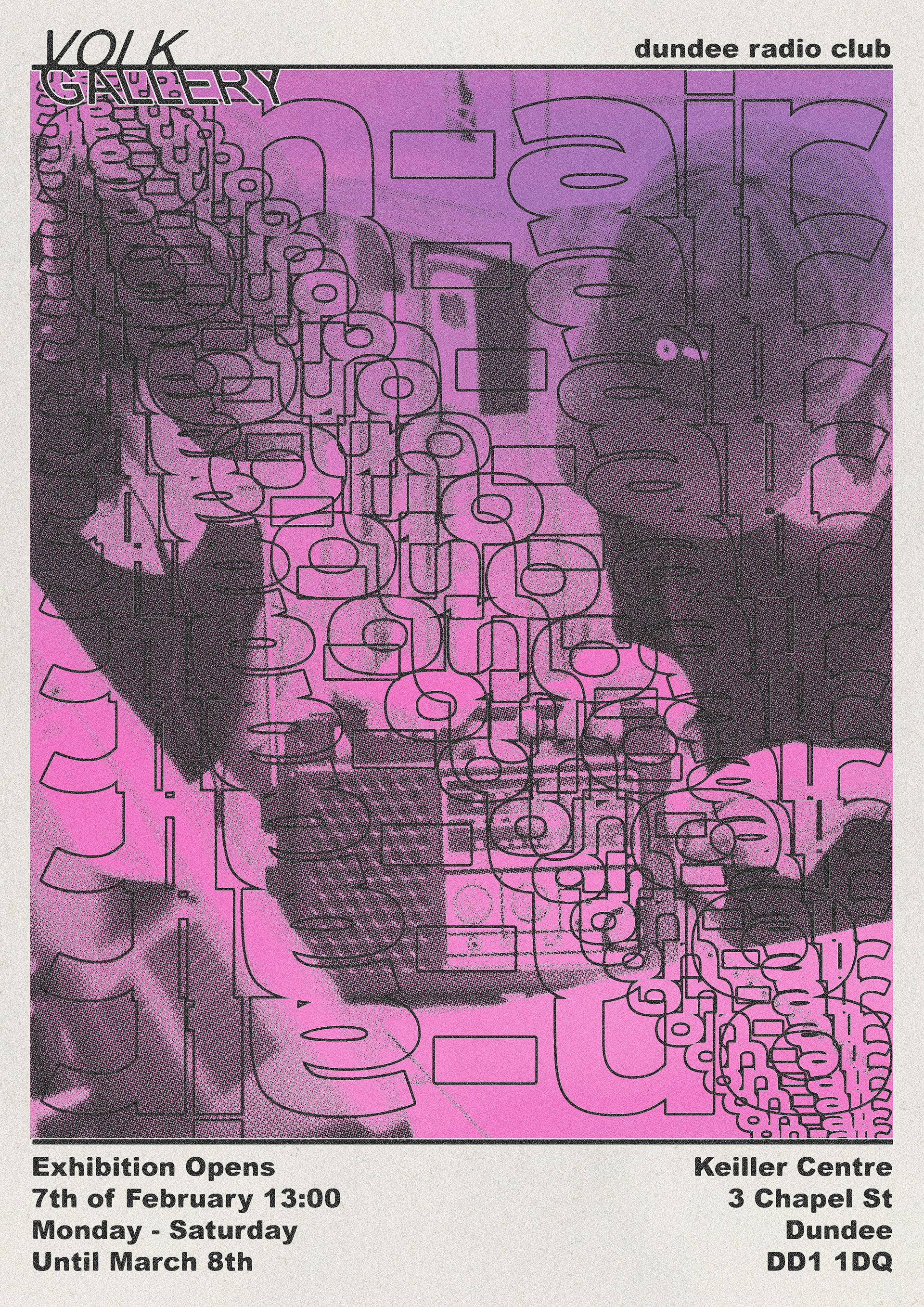 Volk Gallery is proud to present the work of dundee radio club. Each Volk artist is given a size limit and budget and left to their own devices. With this brief, ddrc has produced a club membership pack. Reminiscent of 90s magazine clubs, it’s comprised of everything you’ll need to enhance your festival listening experience; a set of limited edition sonic postcards, badges, posters and more!