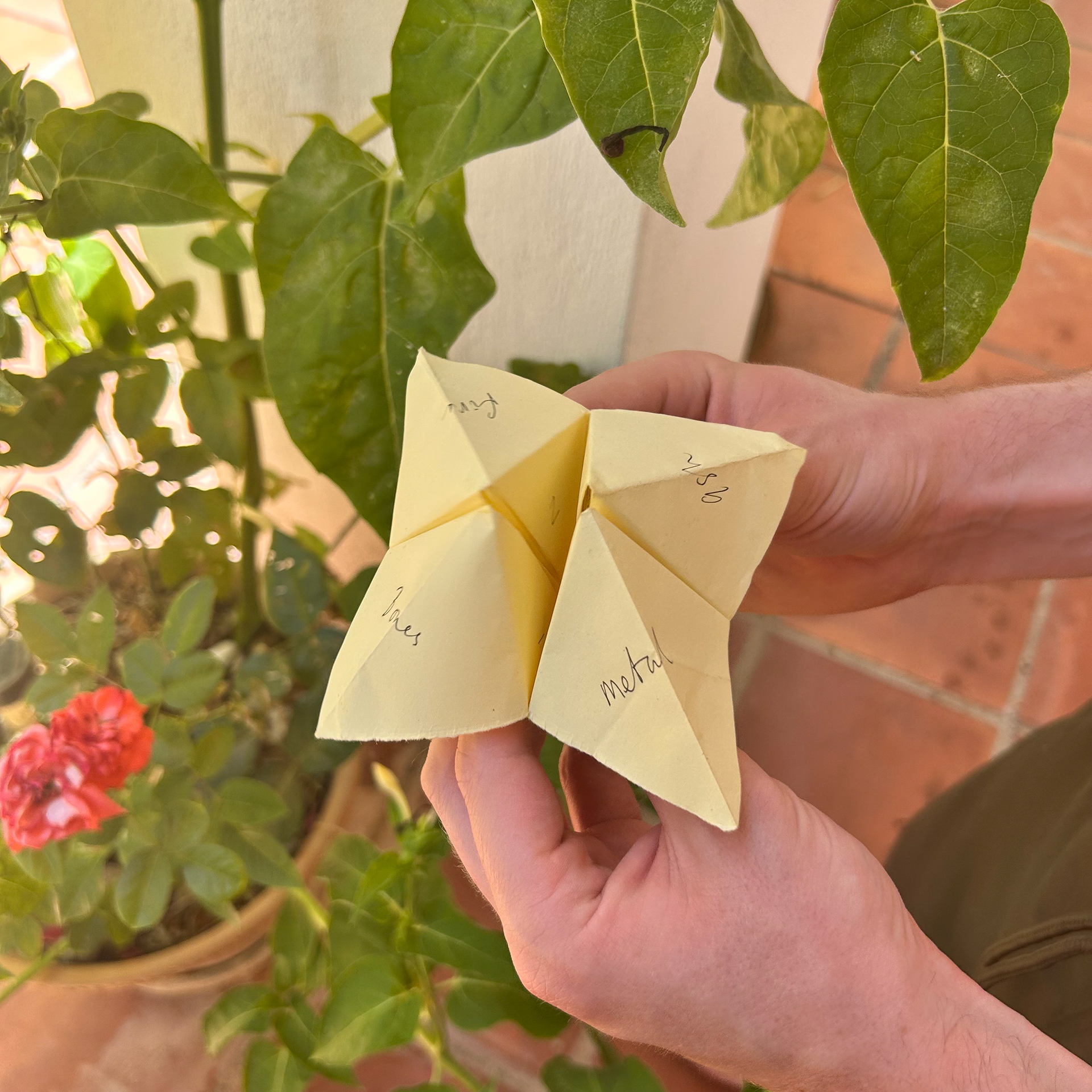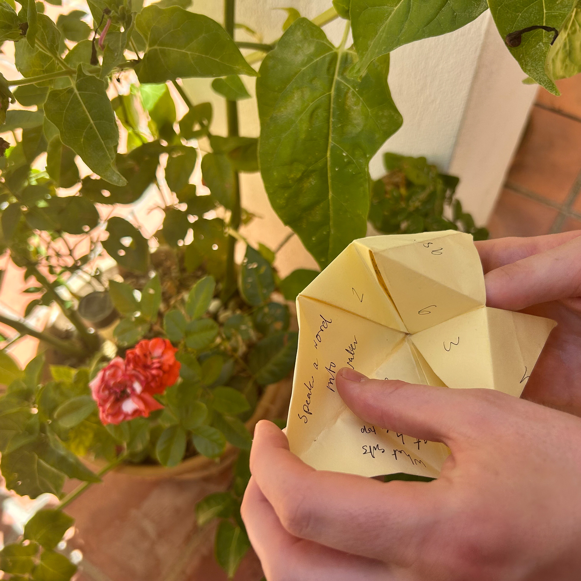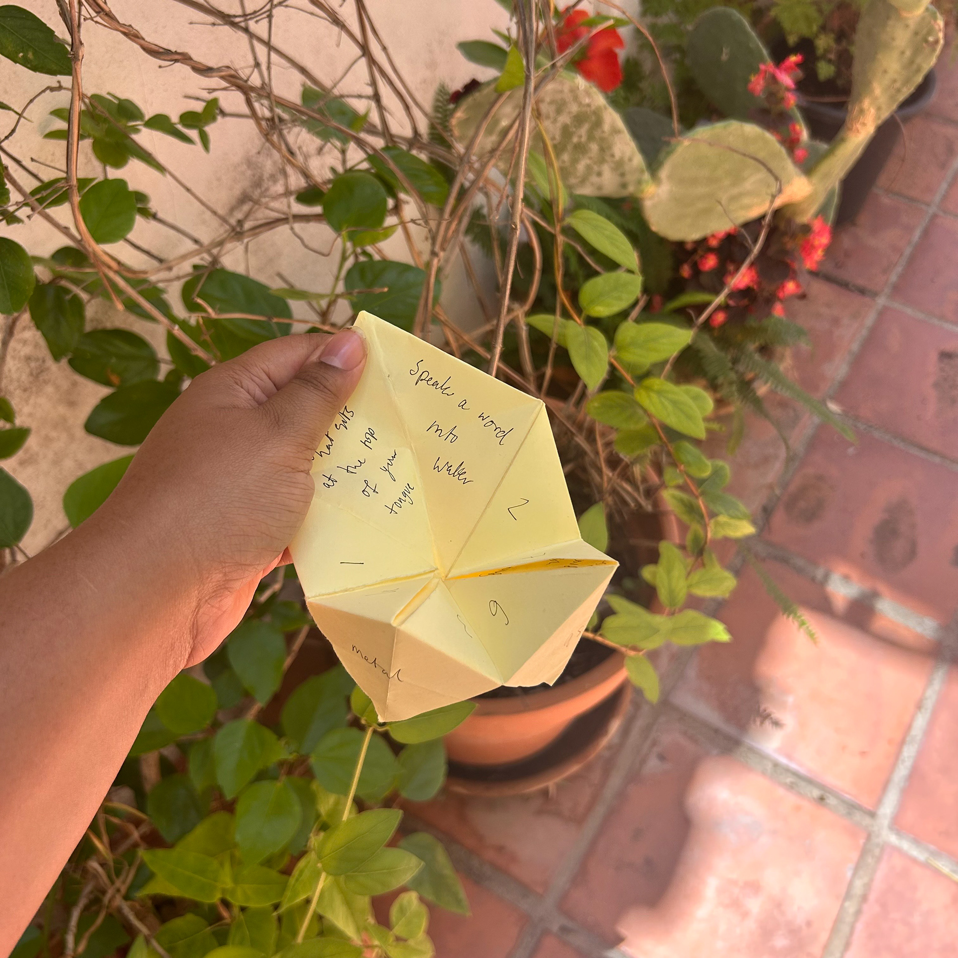 Volk Gallery is proud to present the work of Khadea Santi. Each Volk artist is given a size limit and budget and left to their own devices. With this brief, Santi has produced 50 fortune tellers, reminiscent of those used in childhood games. Santi has developed this version at Glasgow Zine Library with written prompts guiding a poetic offering. Each fortune teller can become a tool for self-mythology and a space to connect with the unknown — a way to ask questions, hold complexity, and make something new together. Much of Santi’s work is rooted in speculation, chance, and play.