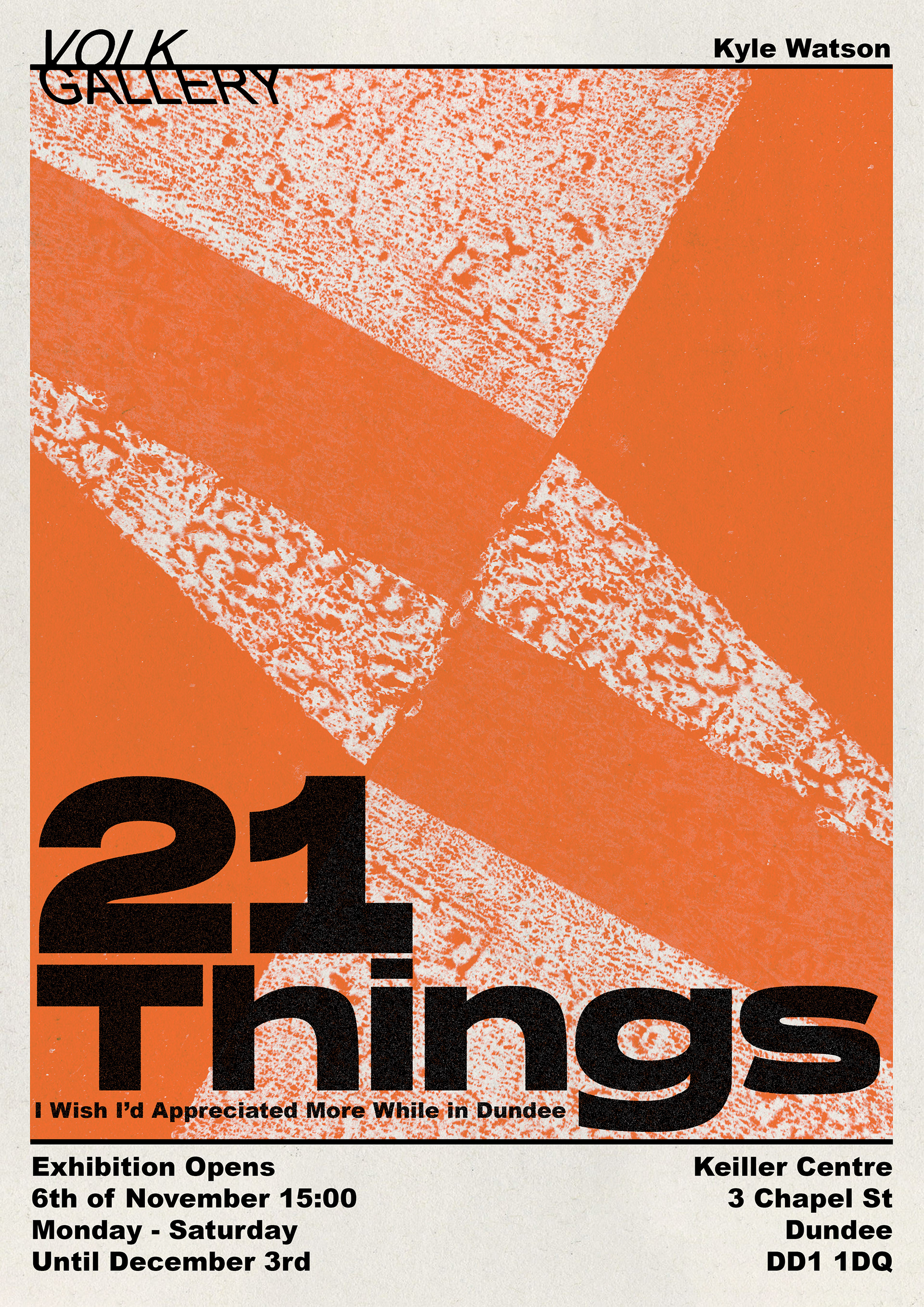 Volk Gallery is proud to present the work of Kyle Watson. Each Volk artist is given a size limit and budget and left to their own devices. With this brief, Watson has produced a series of prints, reflecting on time spent in Dundee whilst studying at Duncan of Jordanstone College of Art & Design. Each edition highlights a visual detail of our city, with it's many textures, shapes and patterns. Watson asks us to take our time, to celebrate the tiny design details that are all around us everyday... until they aren't.