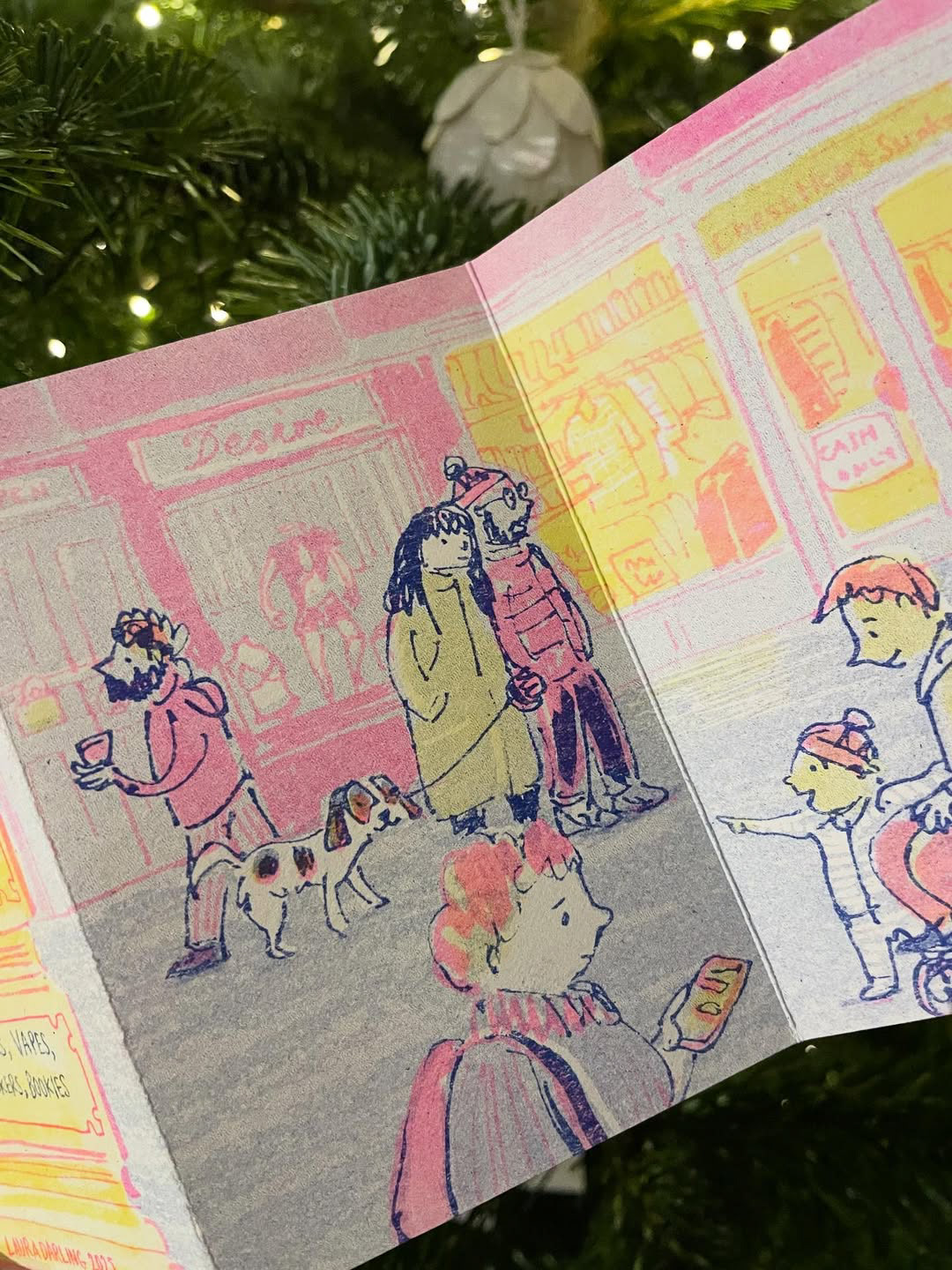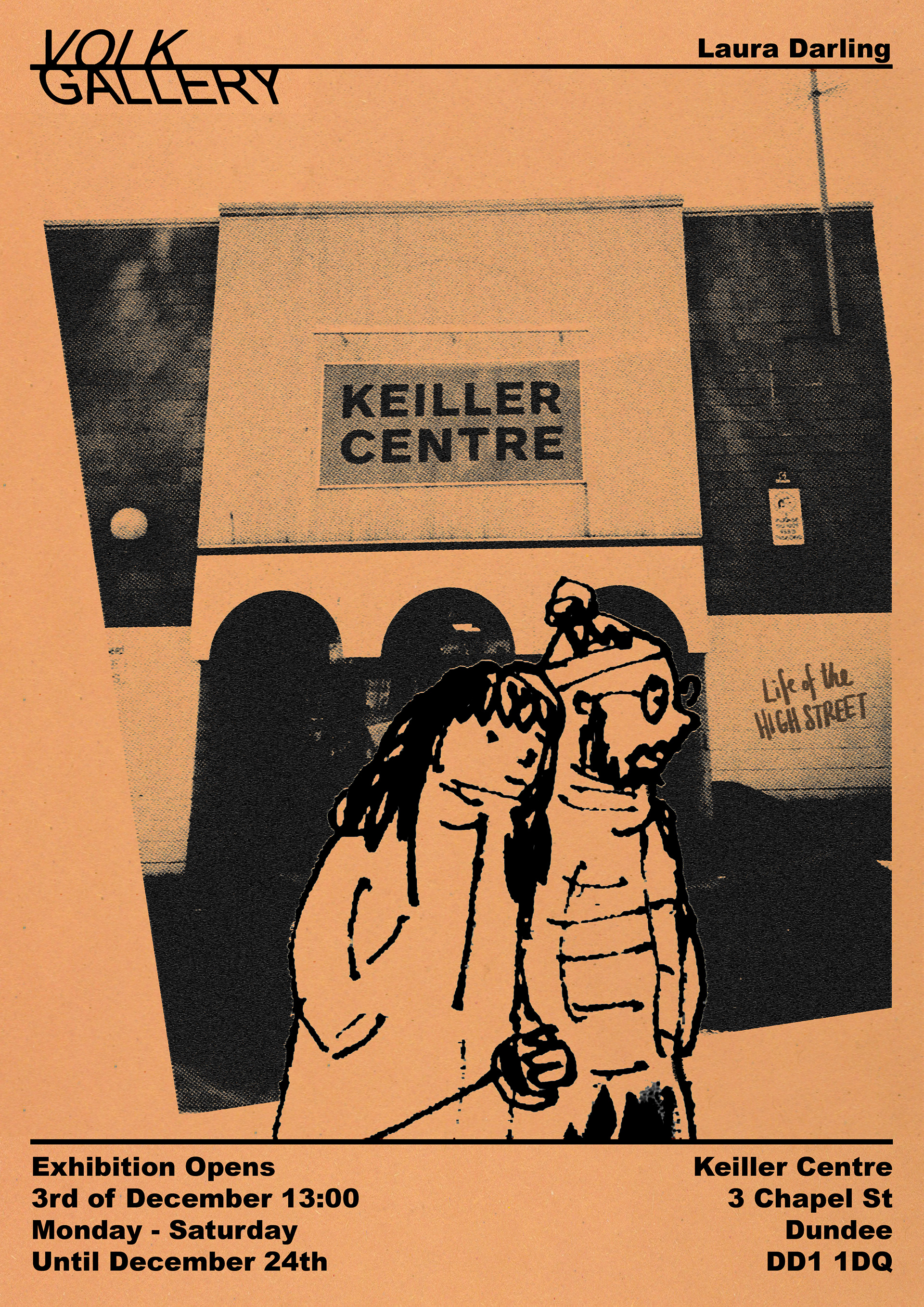 Volk Gallery is proud to present the work of Laura Darling. Each Volk artist is given a size limit and budget and left to their own devices. With this brief, Darling has produced a riso-printed concertina book featuring Dundee shop fronts you may recognise. Rather than an idealised middle-class nostalgia, Darling's High Street illustrates the reality of today's town centres, where grocers and florists have been replaced by charity shops and bookies. The title, a playful poke at the 'Death of the High Street' trope, offers a note of optimism, the 'life' being the characters who move through the street - people on their way to work, shoppers, children, dogs, families and friends.