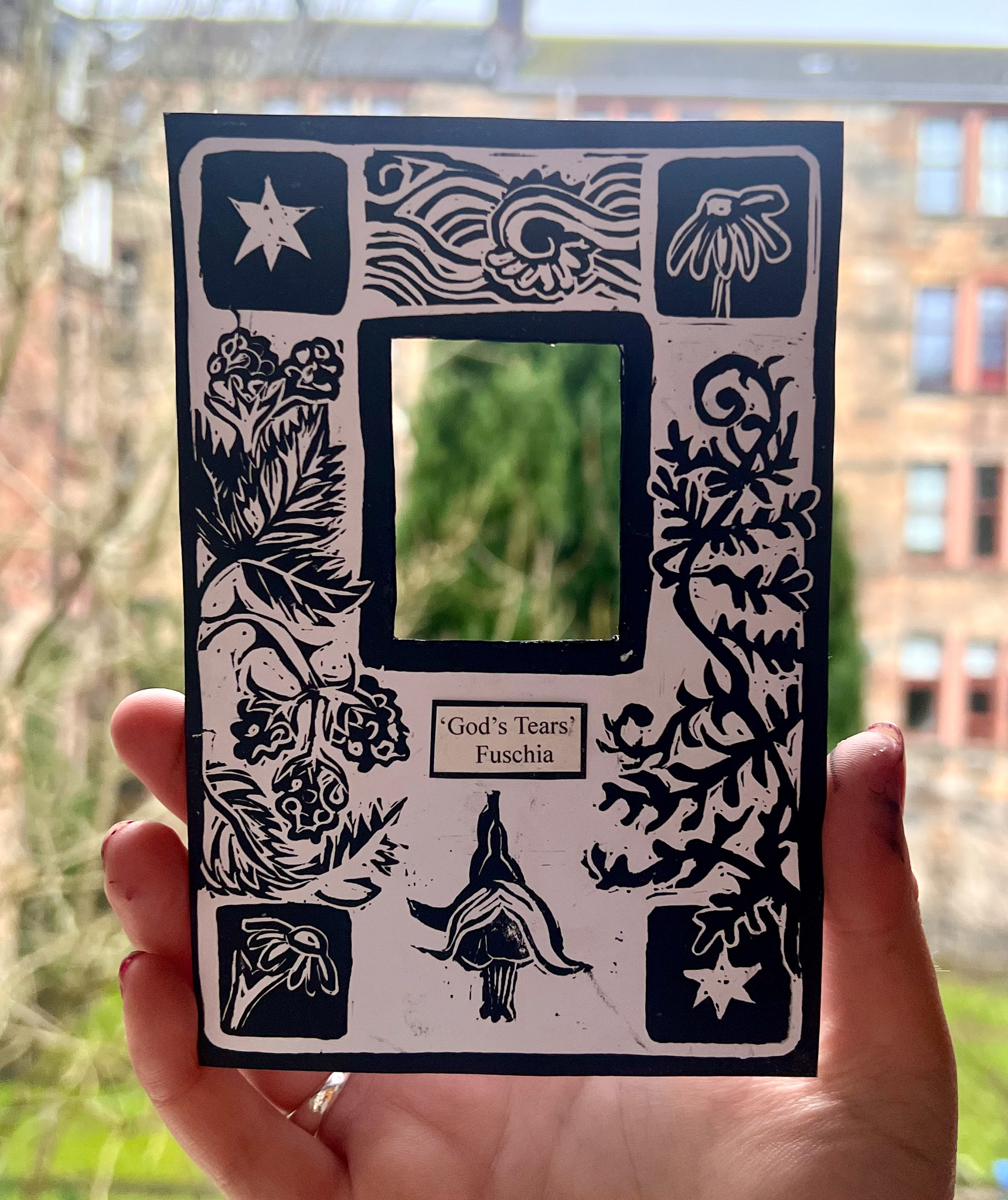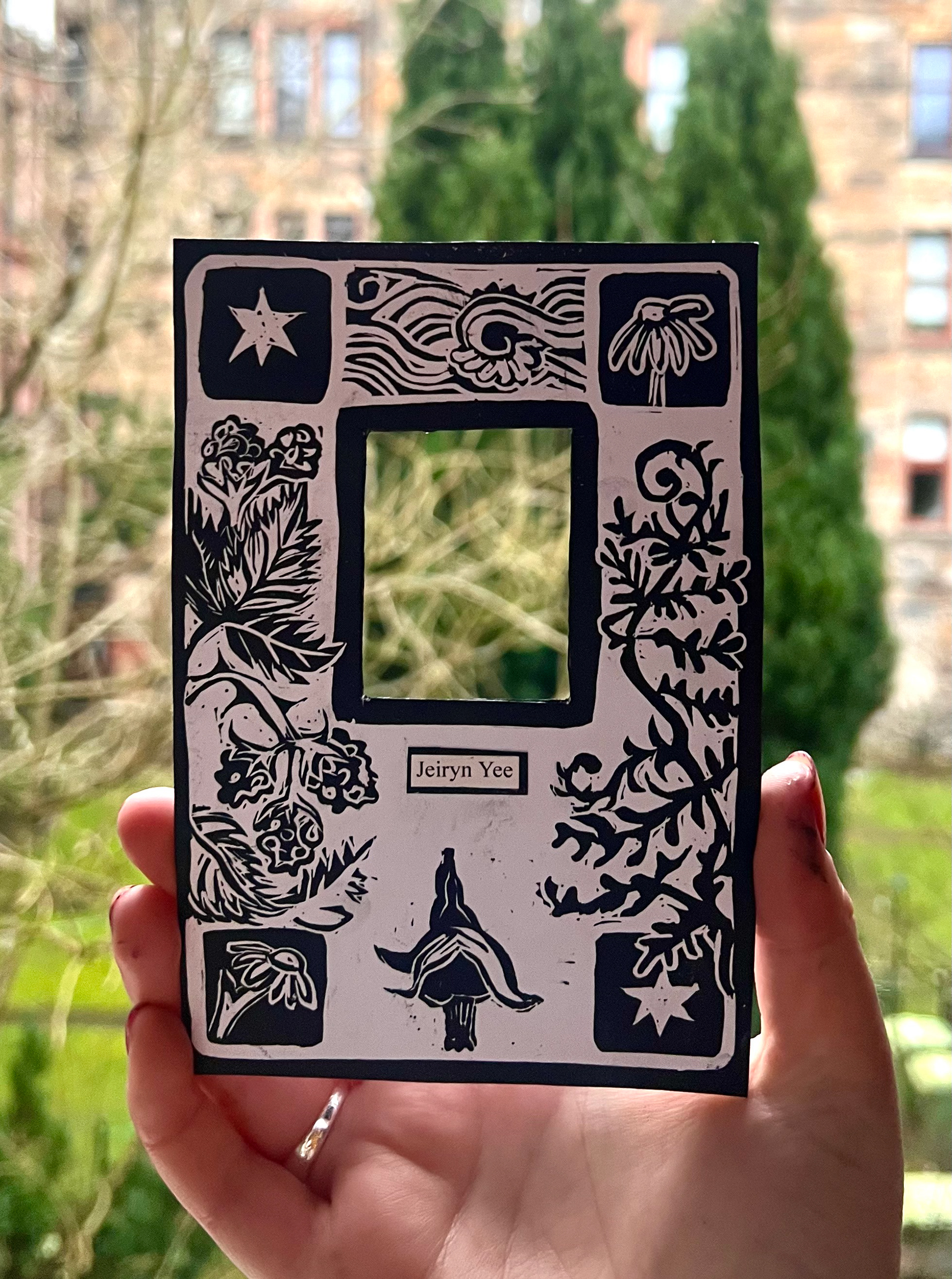 Volk Gallery is proud to present the work of Maeve Callister-Wafer. Each Volk artist is given a size limit and budget and left to their own devices. With this brief, Callister-Wafer has produced viewfinders, adorned with graphic lino prints. Manx Gaelic, Callister-Wafer’s native language from the Isle of Man, often acts as the driving force behind her work. These viewfinders encourage us to look at how the landscape and language reflect and shape each other, and the impacts of their decline and revival. The editions connect Gaelic Manx and English words with nature, pushing us to get outside and perhaps even learn a little Manx.