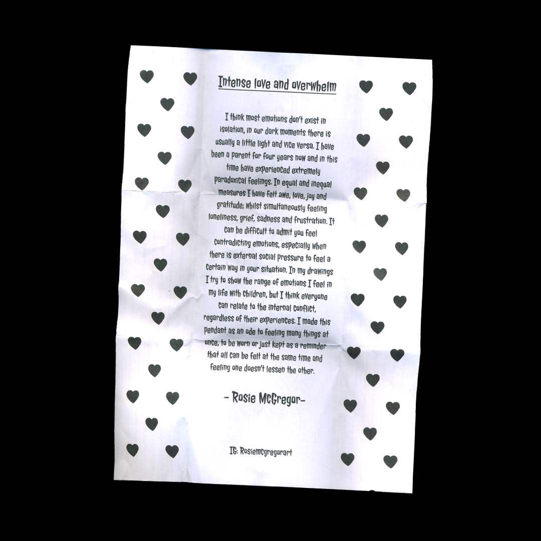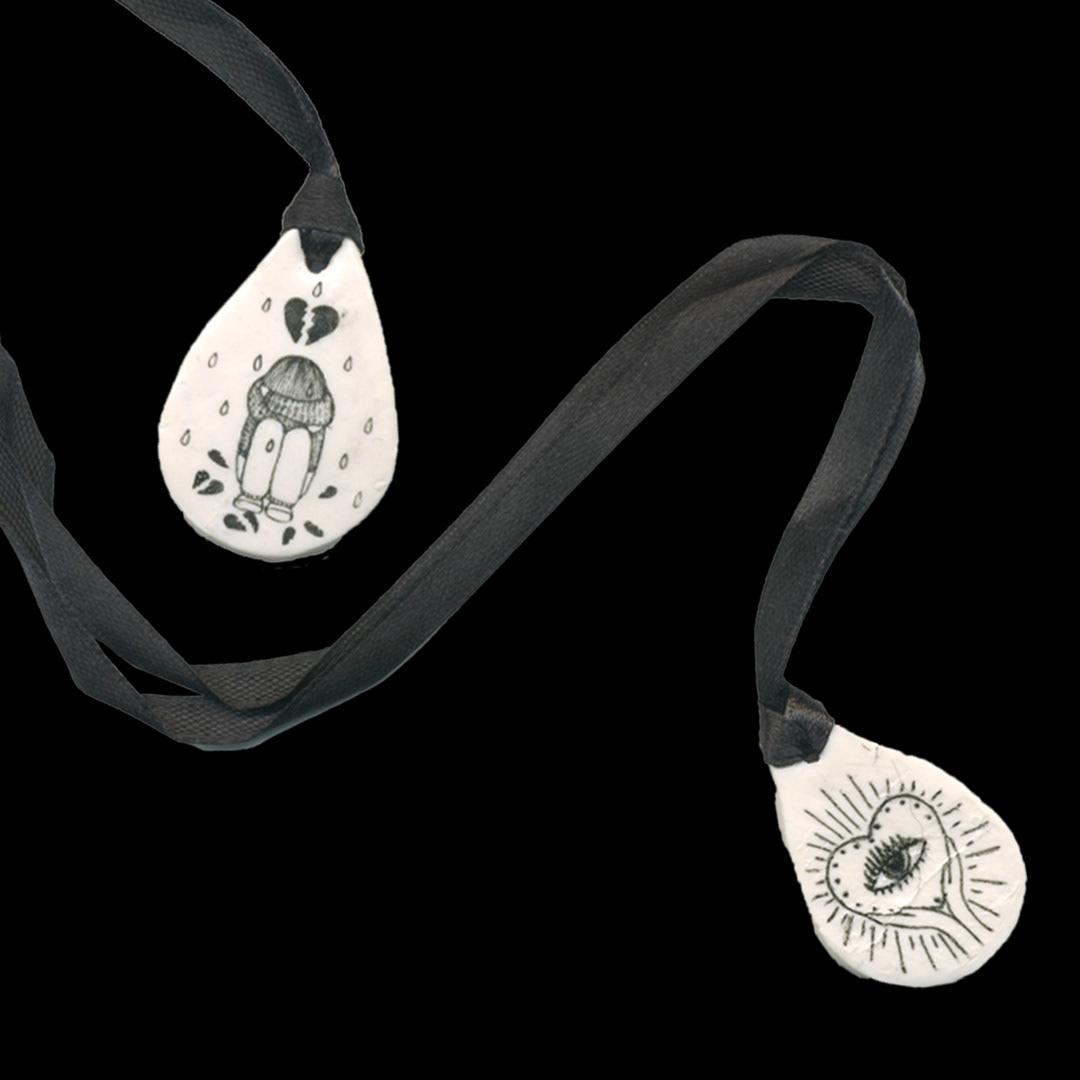 Volk Gallery is proud to present the work of Rosie McGregor. Each Volk artist is given a size limit and budget and left to their own devices. With this brief, McGregor has produced a series of clay pendants as small tokens honouring our paradoxical emotions; a reminder that it is both normal and acceptable to experience a spectrum of emotions, regardless of the social expectations. Feeling both intense love and overwhelmed is typical for many people and does not invalidate the experience.